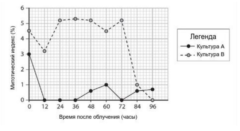 Для исследования клеточного цикла использовали две культуры клеток. Клетки в культуре А имеют функционирующий ген P21. Клетки в культуре B не имеют функционирующего гена P21. Обе культуры были обработаны гамма-излучением. Затем отбирали образцы из обеих культур с интервалом в 12 часов и рассчитывали митотический индекс. Результаты показаны на графике ниже. Какой вывод можно сделать на основе этой информации?