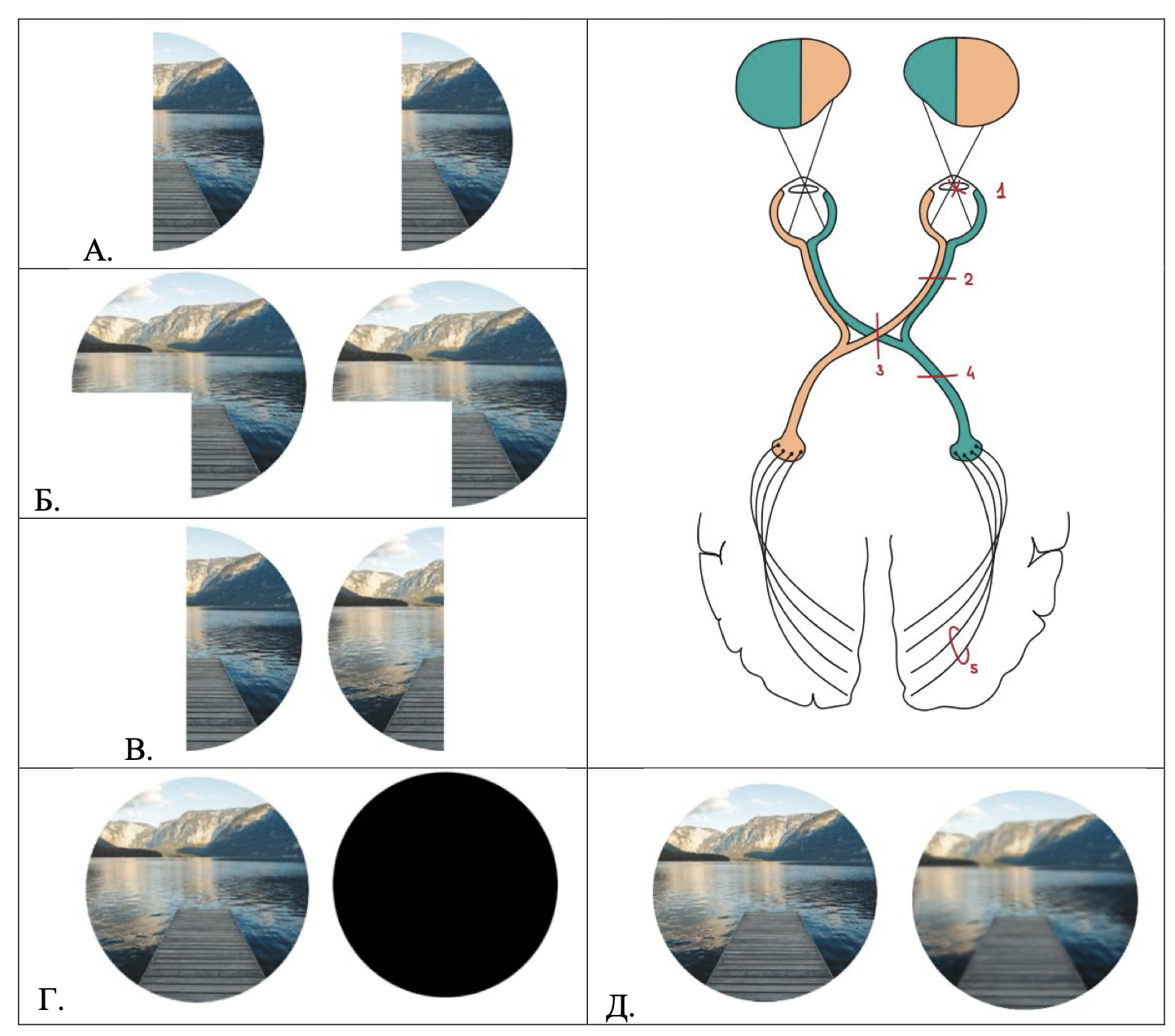 Перед вами проводящий путь зрительного анализатора. Соотнесите уровни поражения (1−5) с нарушениями зрения (А−Д).