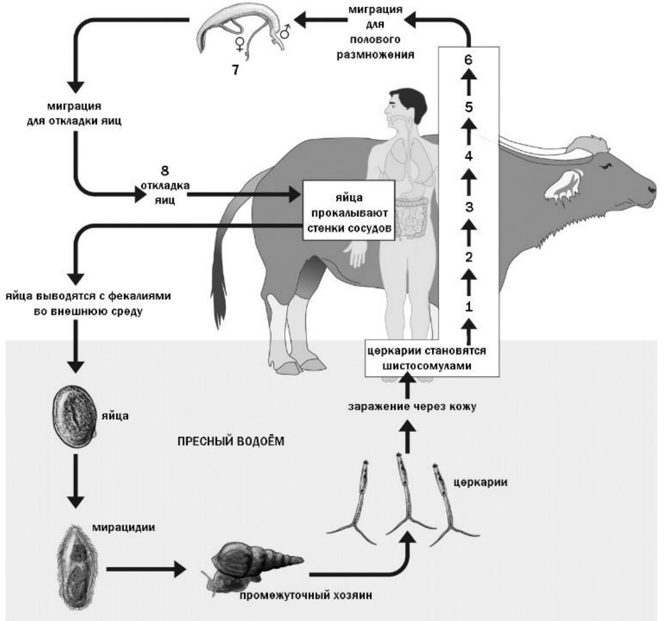 Шистосомозы – это группа паразитарных заболеваний, вызываемых дигенетическими сосальщиками из рода Шистосома (Schistosoma). Шистосомозы распространены в тропических регионах и наносят существенный вред здоровью человека; хроническая инвазия может в некоторых случаях привести к смерти. Понимание жизненного цикла шистосом и их взаимоотношений с хозяевами помогает разрабатывать меры профилактики и лечения. Рассмотрите схему жизненного цикла Шистосомы японской. В организме окончательного хозяина паразиты совершают сложную миграцию (1-8). Половозрелые черви мигрируют в сосуды воротной системы печени (7), а затем в брыжеечные вены для откладки яиц (8).