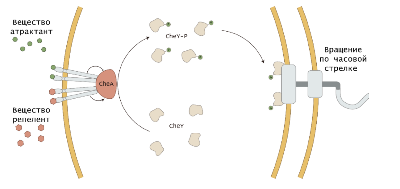 Для бактерий имеет значение направление вращения жгутика. Если жгутики вращаются по часовой стрелке – бактерия совершает случайные вращательные движения (кувыркание), если жгутик вращается против часовой стрелки, бактерия совершает направленное прямолинейное движение. Важную роль в регуляции вращения жгутика осуществляют хеморецепторы. Связываясь со своим лигандом, такие рецепторы могут изменять направление вращения жгутика через каскад регуляторных белков. Схема подобного каскада приведена на рисунке ниже. Изучите рисунок и расположите в правильном порядке события от раннего к позднему (от 1 до 5), которые происходят при появлении глюкозы в среде. Обратите внимание на то, что среди вариантов ответа есть лишние.