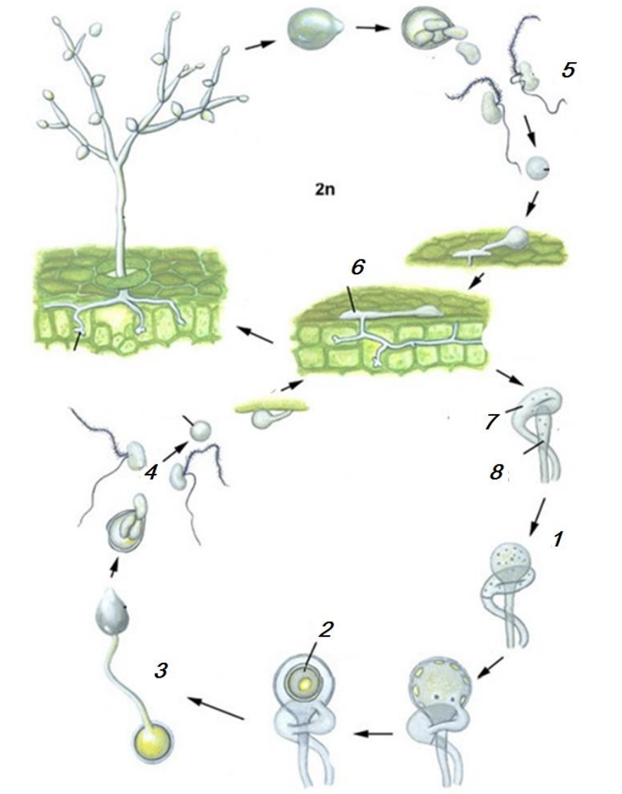 На рисунке представлен жизненный цикл грибоподобного протиста - паразита картофеля. Соотнесите цифры на рисунке (1–8) со стадиями жизненного цикла и органами размножения (даны с избытком, а некоторые могут быть использованы несколько раз).