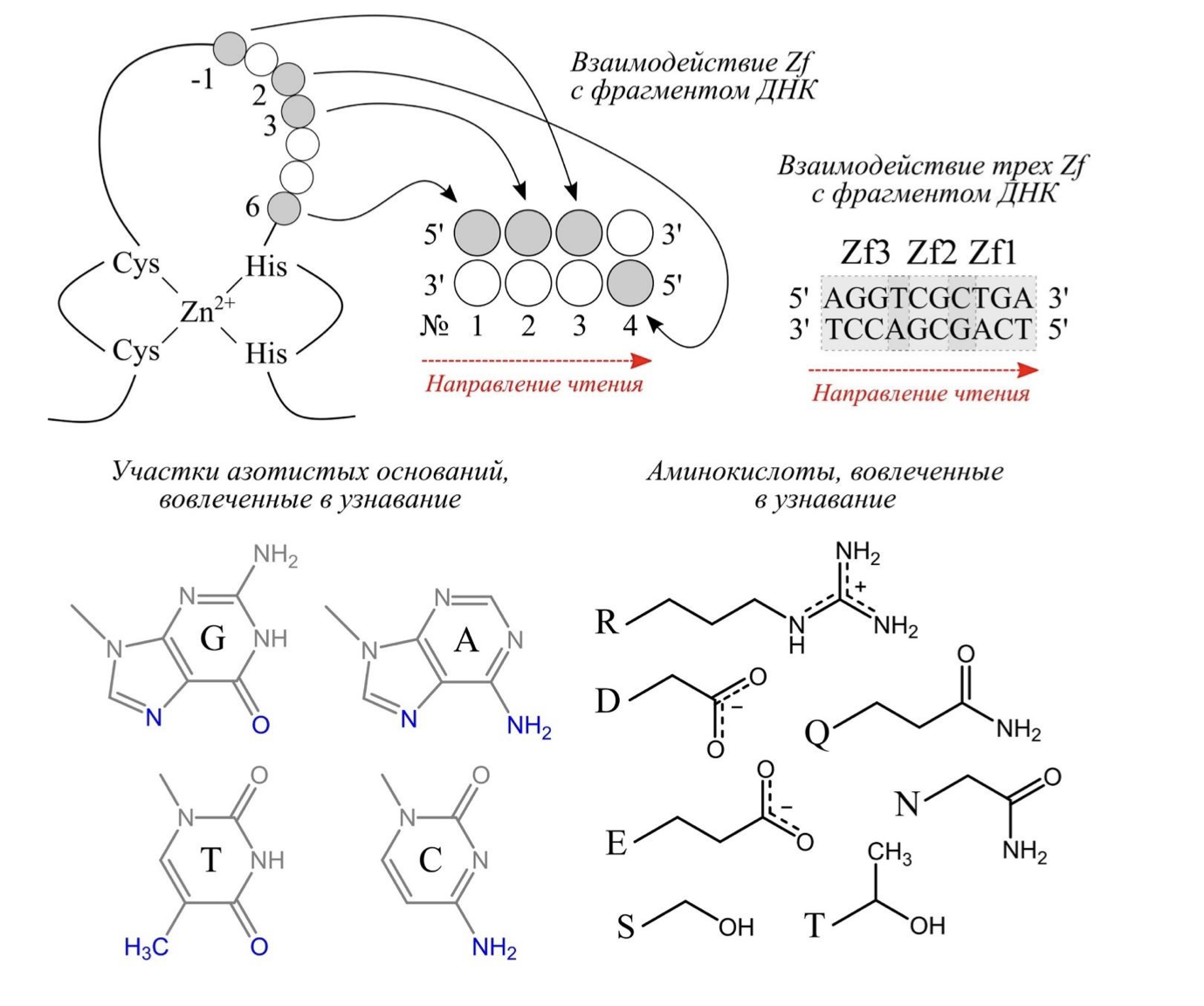 До того, как технологии на основе системы CRISPR-Cas стали главенствующими подходами по направленному редактированию геномов, для данных целей активно применяли белки, содержащие так называемые «цинковые пальцы» (Zf). Данные белки содержат особые петли, аминокислотные остатки которых (пронумерованы от -1 до 6) узнают азотистые основания в составе молекулы ДНК (пронумерованы от 1 до 4). Научные коллективы по всему миру разработали множество искусственных систем на основе таких белков. В рамках одной из них авторам удалось добиться невырожденного кодирования. Это значит, что каждая из аминокислот на рисунке (обозначены однобуквенным кодом) узнает лишь одно из азотистых оснований. Синим цветом мы обозначили те регионы ДНК, которые вовлечены в обсуждаемые взаимодействия (при каждом акте узнавания все «синие» участки должны контактировать с партнерами). Существует два неочевидных исключения, которые мы упомянем напрямую: G во втором положении ДНК может быть распознан гистидином (H) и G в 4 положении ДНК может быть распознан серином (S). Обратите внимание, что при распознавании длинных участков ДНК зоны, взаимодействующие с разными Zf, перекрываются. Последовательности Zf записываются в порядке -1, 2, 3 и 6. Считайте, что для эффективного распознавания участка ДНК все аминокислотные остатки Zf-доменов должны провзаимодействовать с ДНК.
