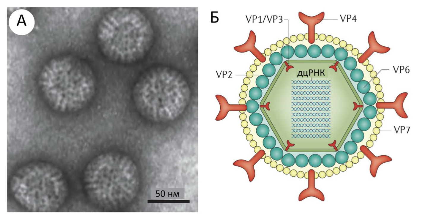На рисунке А показана фотография определенного инфекционного агента, которая была получена с помощью электронного микроскопа, а на рисунке Б – его схема строения. VP1 - VP7 – молекулы белков, дцРНК – двуцепочечные РНК. Белки VP1 и VP3 образуют фермент, обладающий РНК-зависимой РНК-полимеразной активностью.