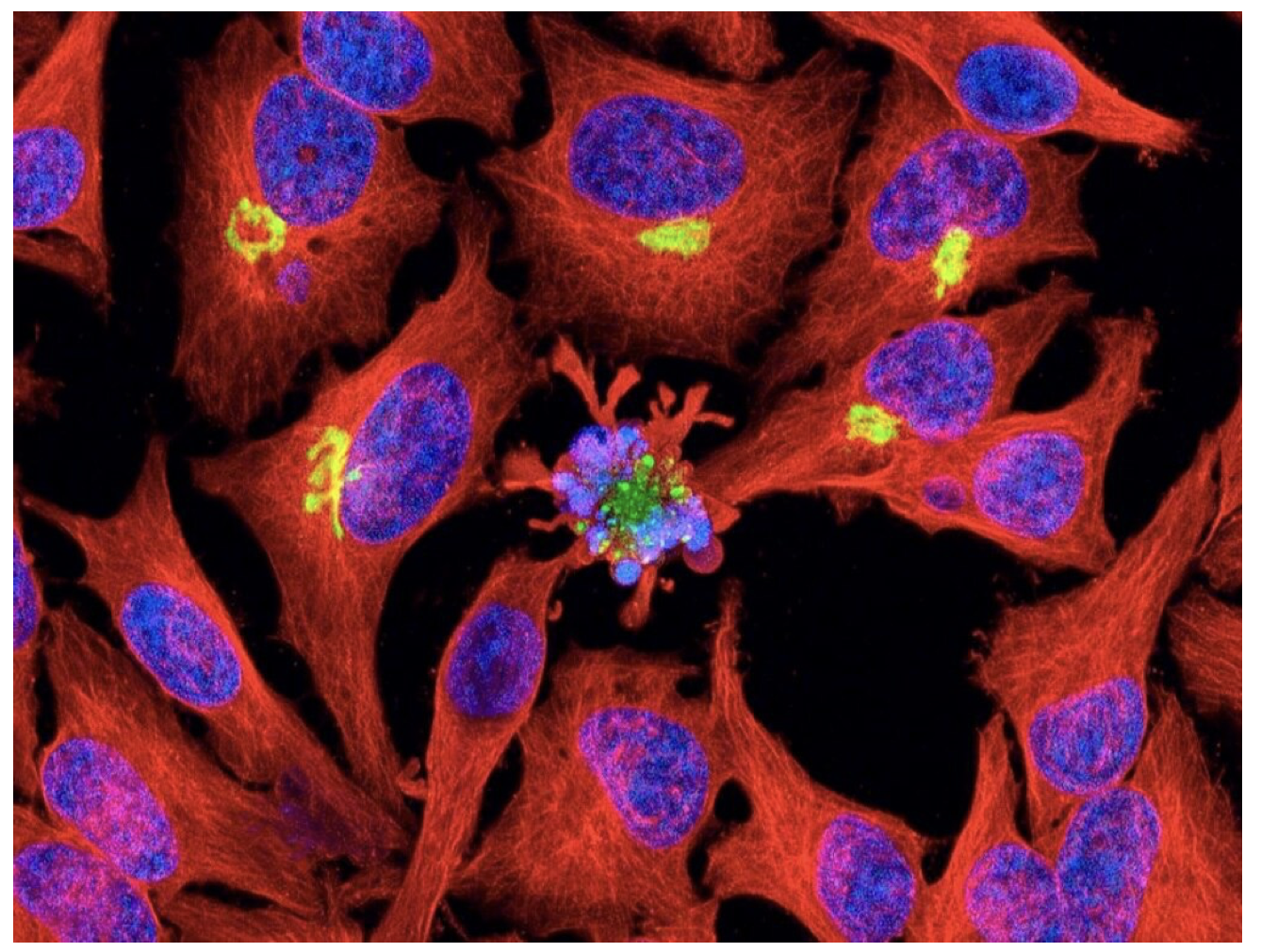 На микрофотографии представлена группа флуоресцентно окрашенных клеток. Синяя флуоресценция соответствует ДНК-связывающему красителю, красная флуоресценция – определённому белку микротрубочек, зелёная – белкам комплекса Гольджи. В центре микрофотографии расположена клетка, морфология которой сильно отличается от остальных. Какой процесс НЕ происходит в данной клетке?