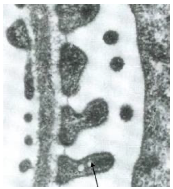 На электронномикроскопическом фото представлен фрагмент почечного фильтра. Что отмечено стрелкой?