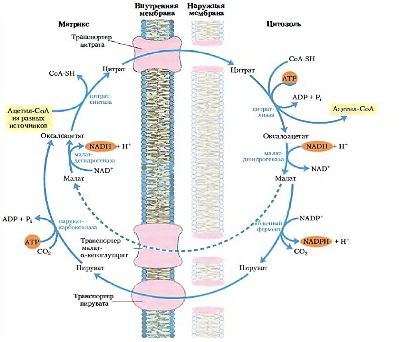 На рисунке представлена схема некоторых транспортных процессов, осуществляемых во внутренней мембране митохондрии, а также некоторых реакций, зависящих от изображённых транспортных процессов. Внимательно рассмотрите схему и выберите верные утверждения.