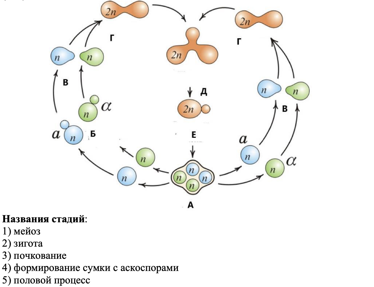 Дрожжи − своеобразная группа грибов, для которых характерно почкование. Рассмотрите рисунок жизненного цикла Saccharomyces cerevisiae и установите соответствия между стадиями жизненного цикла (А−Е) и названиями стадий (1−5).