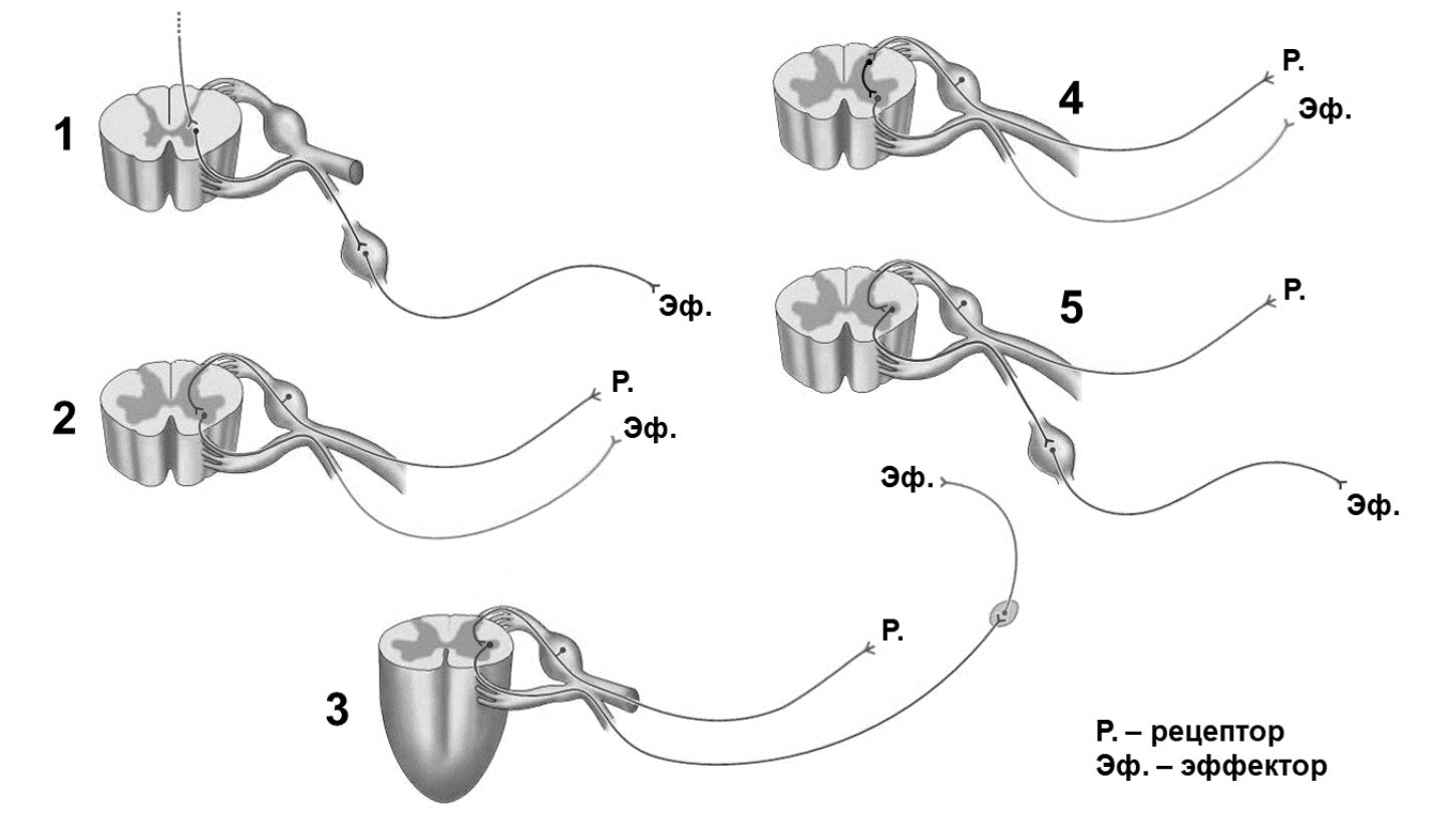 Какие (какая) из рефлекторных дуг, приведенных на рисунке, являются примерами соматической рефлекторной дуги?