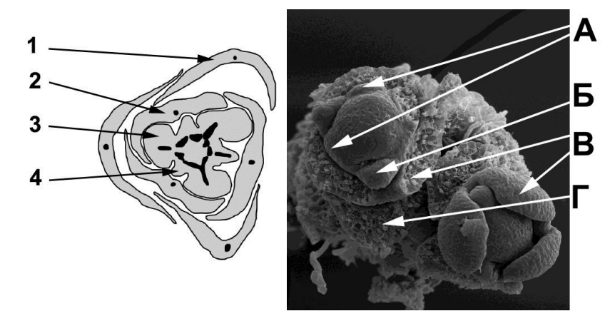 На рисунке слева изображена схема поперечного среза цветка шикши (называние структур дано в описании). Укажите в виде соответствия букв и цифр те же структуры на правом рисунке, где изображены два зачатка цветков того же растения (изображение получено с помощью электронного сканирующего микроскопа):