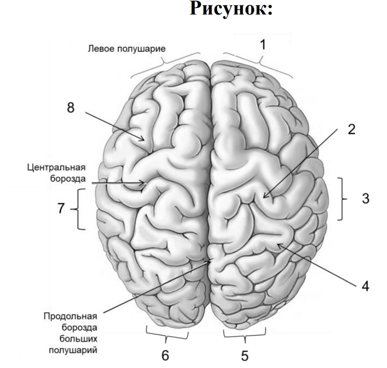 На рисунке изображена поверхность коры больших полушарий человека. Установите соответствие между цифрами на рисунке (1–8), обозначающими области коры, и основными функциями этих областей.