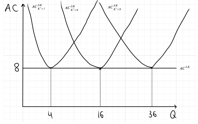 Фирма по производству гвоздей имеет следующую производственную функцию: Q=\sqrt {KL}. В краткосрочном периоде фирма использует фиксированное количество капитала K^*, тогда как в долгосрочном периоде она может самостоятельно выбирать количество капитала, которое будет использовать. Стоимость капитала составляет 16 рублей за единицу, а зарплата. выплачиваемая за единицу труда, равна 1.