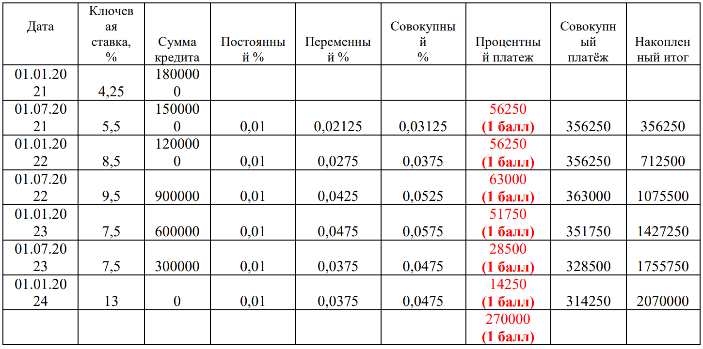 1. Основываясь на данных по ключевой ставке, представленных в таблице, рассчитайте сумму выплаченных процентов по кредиту Михаила, если выплата процентов по кредиту и равномерное погашение тела кредита осуществлялись 1 января и 1 июля каждого года.