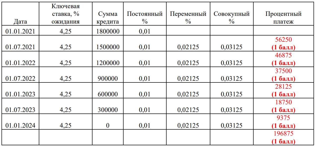 1 января 2021 года Михаил взял в кредит в банке на сумму 1800000 рублей сроком на 3 года на новое строительство жилого дома. Условиями договора была определена плавающая процентная ставка по кредиту, которая состояла из двух частей: постоянная часть – 2\% годовых и переменная часть, которая приравнивалась к ключевой ставке Банка России. Постоянная часть ставки остаётся неизменной на протяжении всего срока кредита, тогда как переменная часть становится равной ключевой ставке 1 января и 1 июля каждого года. Совокупная плавающая процентная ставка рассчитывается сложением постоянной и переменной частей, например, для периода с 1 января по 30 июня 2021 года она составила 6,25\% годовых.