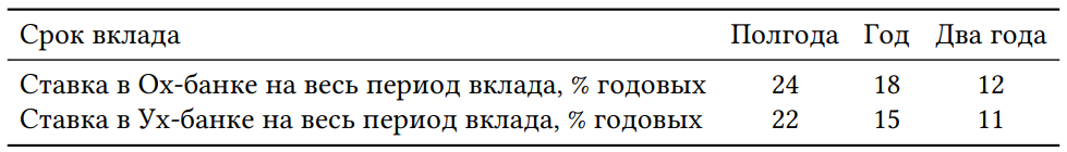 Иннокентий может в любой момент времени иметь максимум по одному вкладу в каждом из банков. Иннокентий также убеждён, что уже через полгода процентные ставки упадут и будут держаться на уровне 10\% годовых. Через полгода можно будет вложить деньги в любой из банков под 10\% годовых на полтора года. Через год можно будет вложить деньги в любой из банков под 10\% годовых сроком на год.
