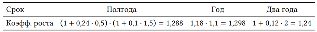 После истечения вклада сроком полгода или год Иннокентий вложит деньги на оставшийся срок под 10\% годовых. В Ух-банке все предлагаемые в начале ставки ниже, чем в Ох- банке, поэтому первый вклад следует делать в Ох-банк, а дальше можно вкладывать в любой банк, главное, чтобы общая сумма с учетом накопленных процентов в каждом банке была не более 1,4 млн руб. Рассчитаем коэффициент роста суммы денег за 2 года при разных сроках первого вклада в Ох-банк: