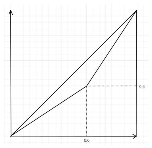 В стране живут две группы населения: бедные и богатые. Внутри групп доход распределен равномерно. Известно, что бедные составляют 60\% от населения страны и владеют 40\% совокупного дохода страны. Постройте кривую Лоренца для этой страны и рассчитайте значения коэффициента Джини.