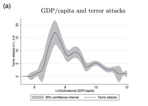 В мае 2023 года было проведено исследование о взаимосвязи среднего дохода граждан и количеством террористических актов. В исследовании были использованы данные по 1527 регионам из 75 различных стран в период с 1970 до 2014. Авторы статьи пришли к выводу, что рост доходов в более бедных странах первоначально сопровождается увеличением террористической активности. И только когда средний доход достигает уровня примерно 12 \ 800 долларов, дальнейший рост доходов сопровождается устойчивым ослаблением терроризма. Ниже представлены графики, по горизонтальный оси которых расположен ВВП на душу населения(а точнее его натуральный логарифм, но если Вы не знакомы с понятием логарифма - ничего страшного; можете считать, что это просто ВВП на душу населения, и ответ от этого качественно не изменится), по вертикальной - количество террористических атак.