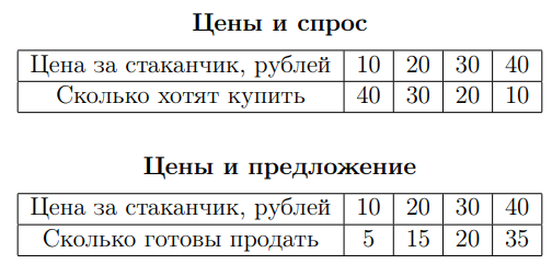 В первой таблице показано, сколько стаканчиков ребята готовы купить при каждой цене. Во второй таблице показано, сколько стаканчиков продавцы готовы продать при каждой цене.