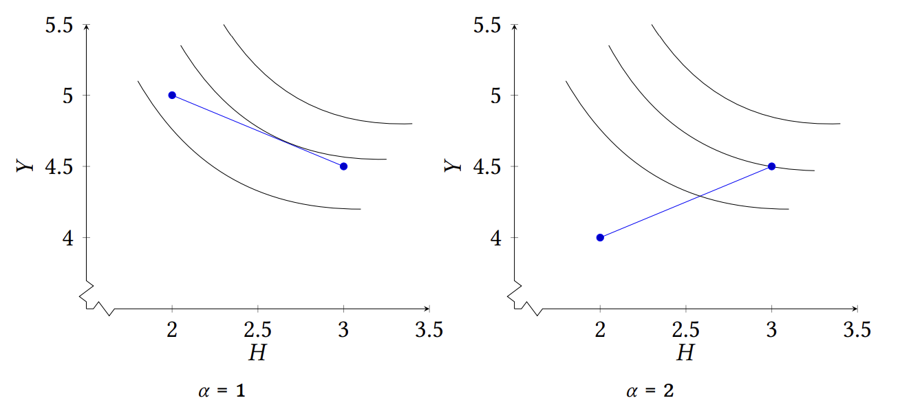 For \alpha=1 the PPF equation is Y = 6 − H /2. It is a downward-sloping line with extreme points (2, 5) and (3, 4.5) (recall that H takes values from 2 to 3). The first point corresponds to d=0 and the second to d=1.