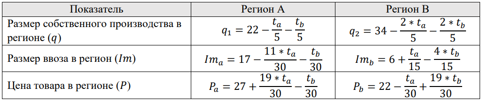 В одной стране один и тот же товар потребляется и производится только в двух регионах. При этом в каждом регионе работает один-единственный производитель этого товара. Экономисты аналитики установили, что перевозка стоит одинаково: по 5 ден.ед. за каждую единицу данного товара в любую сторону, и, что обе фирмы конкурируют по выпускам, выбирая их одновременно. Помимо этого, они выявили следующие зависимости цен, объёмов производства и ввоза от ставок потоварного налога на потребление в каждом регионе ( t_a – ставка налога на единицу товара в регионе A, t_b – ставка налога на единицу товара в регионе B ).