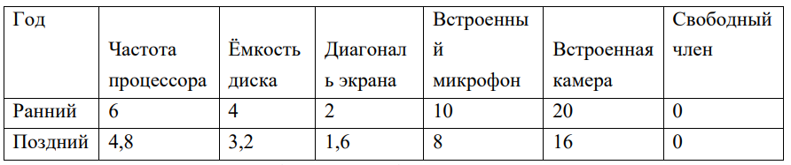 Расчёт средней цены старого ноутбука в новых ценах характеристик. Поскольку из таблицы выше можно видеть, что цена каждой характеристики упала в 1,25 раза, а цена ноутбука в более ранний год линейно зависит от значений характеристик, то получается, что средняя цена ноутбука в старой комплектации упала в 1,25 раза.