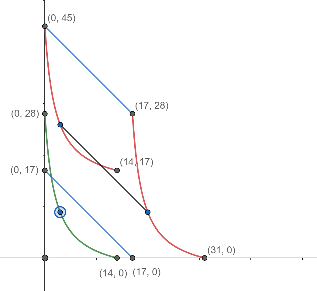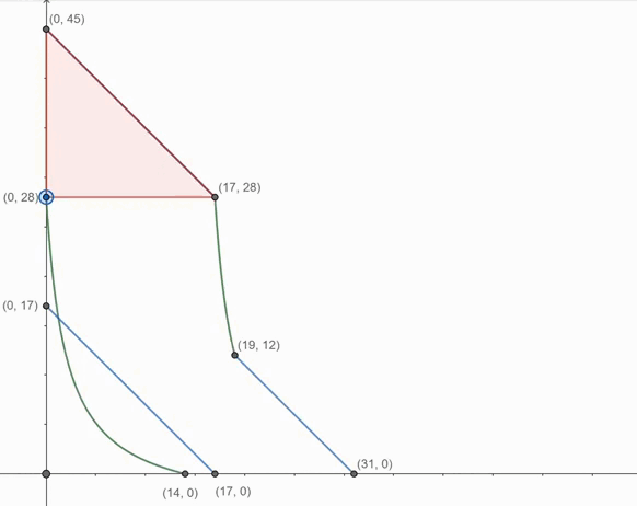 Рассмотрим предельное положение отрезка X_1=X_{max}=14 и назовем его В. При 6<X_1<14, первая кпв будет строго под В, поскольку это параллельные прямые, пересекающие OX в разных точках.