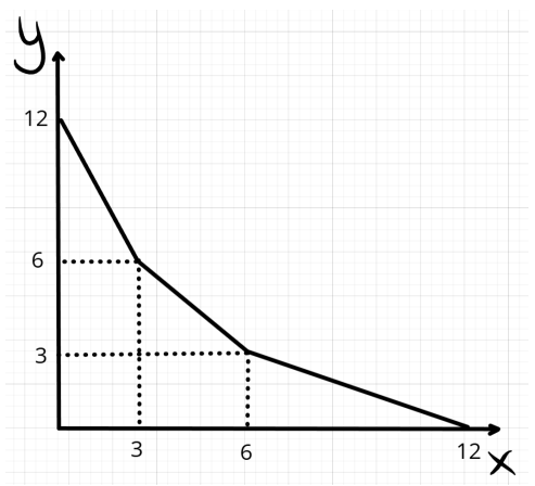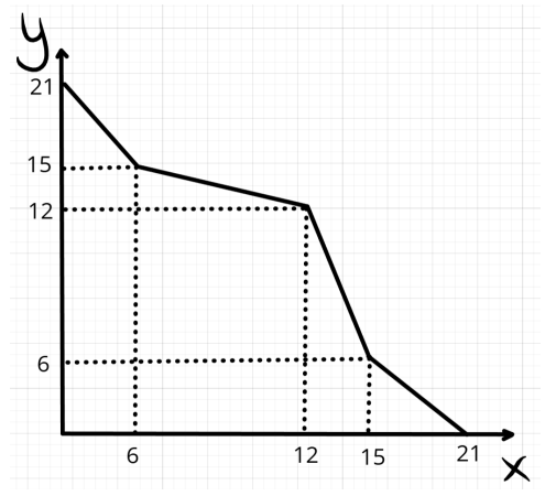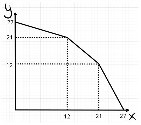 У пожилого фермера, который выращивает на своих полях рожь (X) и пшеницу (Y), есть всего три поля. Уравнения их КПВ имеют следующий вид: y_1=12-2x_1, \ y_2=9-x_2, \ y_3=6-\frac{1}{2}x_3. Фермер сам работать на поле не может, так что он отправляет для работы на полях своих сыновей. Один сын может обработать только одно из трёх полей. Постройте общую КПВ фермера в производстве растительных культур, если:
