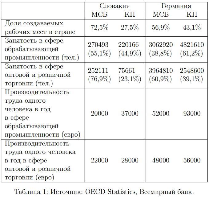 В таблице ниже приведена информация о вкладе МСБ и крупных предприятий (КП) в экономику двух европейских стран. В частности, указана доля общей занятости, приходящаяся на каждую группу предприятий, а также численность и доля занятых в двух крупных секторах — обрабатывающей промышленности и торговле. Производительность труда рассчитана как средняя выручка, создаваемая одним сотрудником предприятия — вклад одного работника в экономику страны.