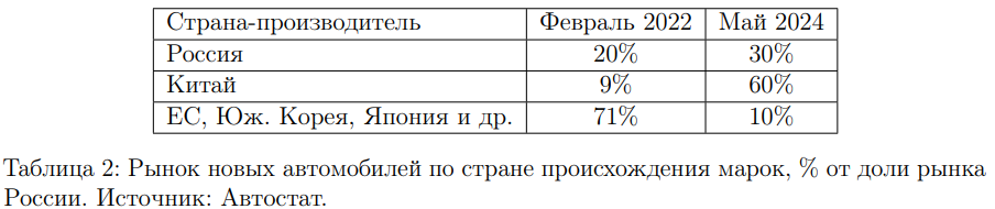 С 2022 года после введения санкций против России и падения курса рубля структура рынка новых автомобилей в России изменилась. По состоянию на май 2024 года около 60\% рынка новых автомобилей принадлежит китайским автопроизводителям, 30\% — российским, тогда как остальные 10\% делят между собой другие страны.