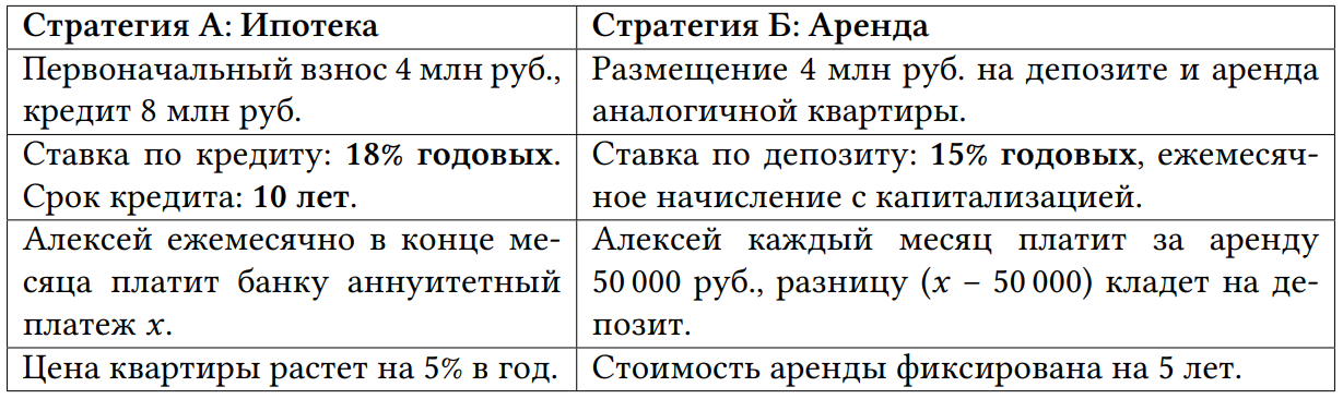 Алексей планирует улучшить жилищные условия. Он выбрал квартиру стоимостью 12 \ 000 \ 000 рублей. У него есть собственные накопления в размере 4 \ 000 \ 000 рублей. Алексей рассматривает две финансовые стратегии на горизонте 5 лет ( 60 месяцев):