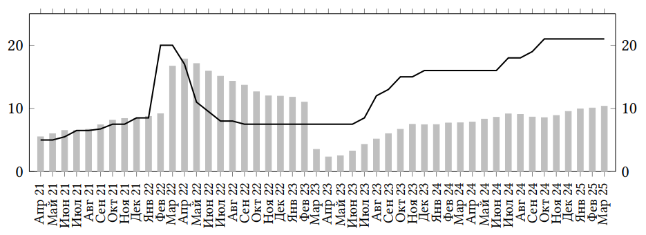 Сегодня, 25 апреля 2025 года (скорее всего, прямо в тот момент, когда вы пишете работу), проходит очередное заседание Совета директоров Банка России по ключевой ставке. После обеда будет объявлено решение, а пока рассмотрим график, показывающий значения инфляции в России год к году и ключевой ставки до текущего момента^2 :