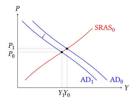 На графике AD-AS это иллюстрируется сдвигом кривой AD вниз, что приводит к снижению уровня цен.