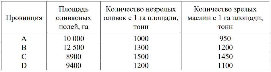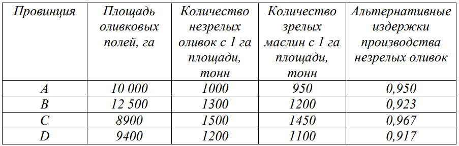 В четырёх провинциях A, \ B, \ C и D выращиваются незрелые оливки и зрелые маслины. Для решения вам эта информация не понадобится, но зрелые маслины отличаются от незрелых оливок только временем созревания – их производство занимает на 2 месяца больше. Для упрощения будем считать, что все провинции используют единственный фактор производства – землю, объём которого измеряется площадью оливковых полей. Производственные возможности каждой провинции приведены в таблице ниже.