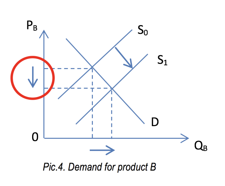 If goods A and B are also complements in production, increase of quantity supplied of A will increase also the supply of B thus causing the downward pressure on the price of B (see Pic. 4).