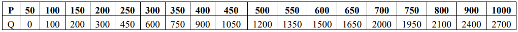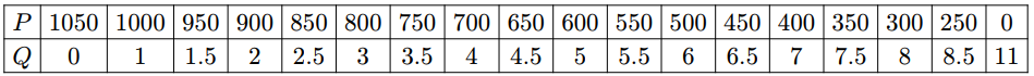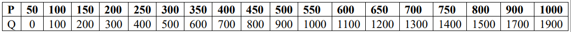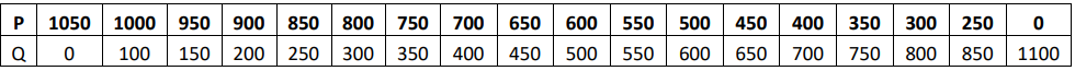 100, Q^{d}=\begin{cases} 1100-P, & \text{если } P\le 1000,\\[2pt] 2100-2P, & \text{если } 1000<P\le 1050,\\[2pt] 0, & \text{если } P>1050. \end{cases}