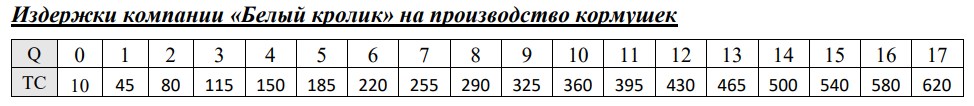 Фирма «Белый кролик» – монополист на рынке уникальных кормушек для животных в Хангрии. Кормушки – произведение технологического искусства, – поэтому фирма «Белый кролик» может произвести не более 17 кормушек в год (издержки производства представлены в таблице).