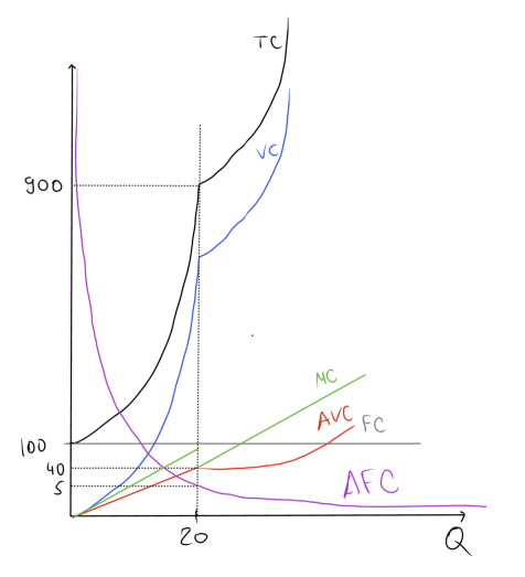 Изобразите данную функцию на графике, и на том же графике как можно более точно изобразите функции VC(Q), \ FC(Q), \ AVC(Q), \ AFC(Q) и MC(Q).