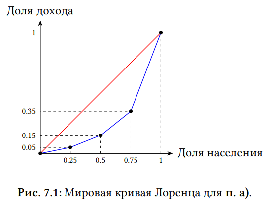 Наконец, чтобы посчитать мировой коэффициент Джини, построим мировую кривую Лоренца. Она представляет из себя ломаную линию, соединяющую точки(0;0), \ (0,25;0,05), \ (0,5;0,15), \ (0,75;0,35), \ (1;1).