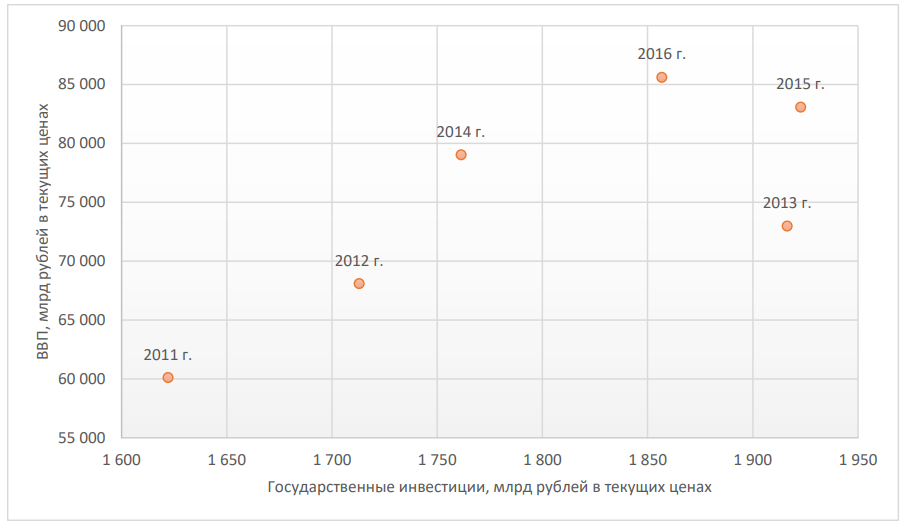На рисунке ниже приведены данные по государственным инвестициям, в терминологии Росстата валовое накопление основного капитала за счёт средств государственного бюджета, и ВВП Российской Федерации за 2011-2016 гг.