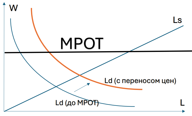 Эффект от введения МРОТ выражается в падении занятости, однако этот эффект ниже за счёт переноса МРОТ в цены (P=4*\sqrt w), т.е. на рисунке введение МРОТ приводит к росту спроса на труд! ( 5 баллов за рассуждение)