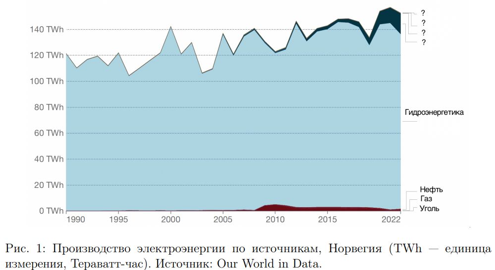 В 2015 году было принято международное Парижское соглашение, в соответствии с которым страны должны бороться с изменением климата, чтобы не допустить повышения температуры больше, чем на 2 градуса Цельсия по сравнению с доиндустриальным уровнем, и прикладывать усилия по ограничению повышения температуры до 1,5 градуса Цельсия. Для этого страны могут принимать различные меры, такие как уменьшение выбросов парниковых газов, увеличение зелёных насаждений и лесов, внедрение энергоэффективных технологий. Одной из стран, подписавших Парижское соглашение, стала Норвегия. В соответствии с соглашением Норвегия обязалась к концу 2030 года сократить выбросы не менее чем на 50\% по сравнению с уровнем 1990 года, а к 2050 году — примерно на 90-95\%. В 2023 году выбросы углекислого газа в стране превысили уровень 1990 года на 10\%. Уже больше 5 лет все выбросы парниковых газов в стране облагаются налогом, который составляет около 76 евро за тонну углекислого газа. Кроме того, было объявлено о постепенном повышении ставки налога до 196 евро за тонну к 2030 году. Энергетическая система Норвегии практически полностью основывается на возобновляемых источниках энергии: в 2020 году на их долю приходилось 98\% выработки электроэнергии (рисунок 1 ). Норвегия также является чистым экспортёром электроэнергии: в 2020 году экспорт составил 20,5 млрд киловатт-часов.