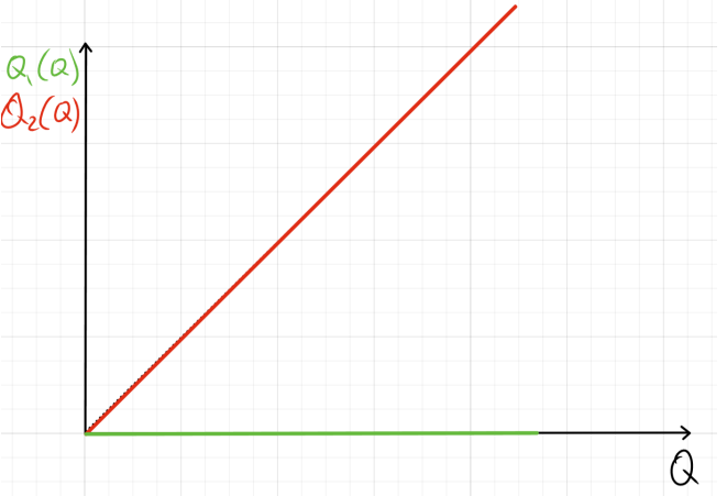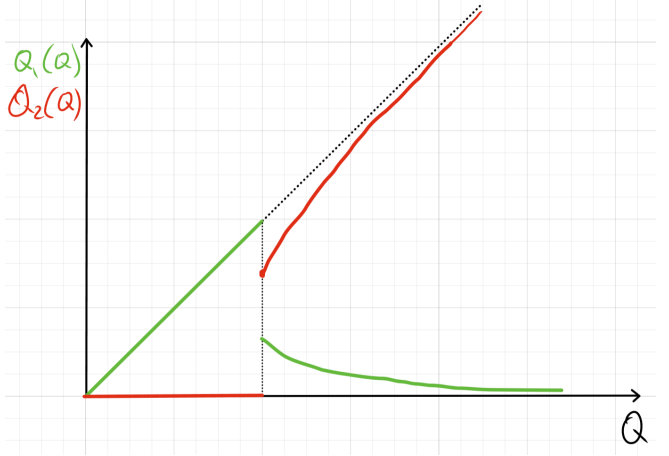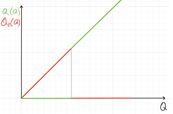 Сначала Q_1=Q, Q_2=0, потом MC_1=MC_2.