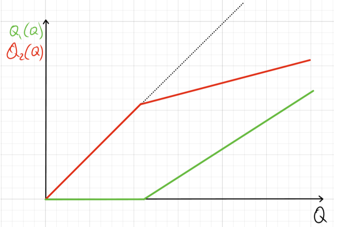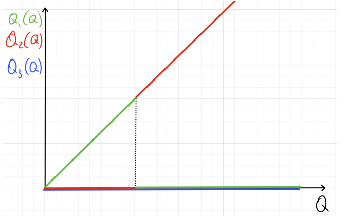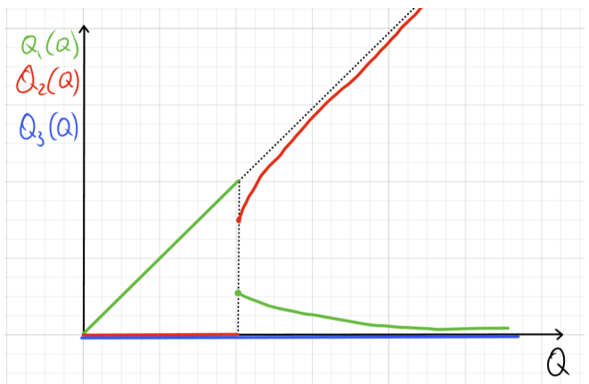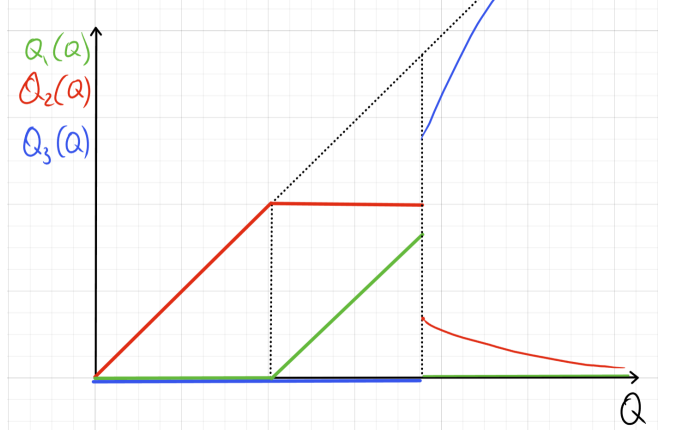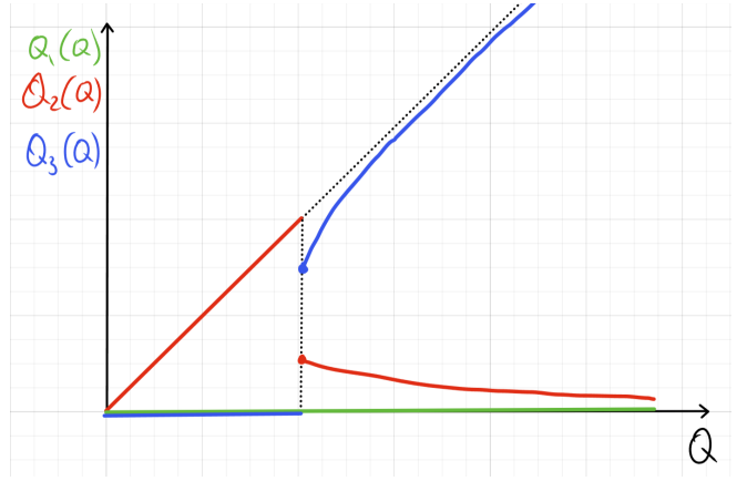 Для каждого пункта найдите условия оптимума, то есть соотношения между величинами, которые должны выполняться в оптимуме (в том числе и если количества товаров равны 0 ), при выводе общей функции издержек TC=f(Q), при a>0, \ b>0, \ c>0. В явном виде функцию выводить не требуется. Также нарисуйте на графике функции Q_1(Q), \ Q_2(Q) и Q_3(Q), то есть то, как примерно будет меняться распределение производимого товара по заводам. Если в задаче возможны несколько вариантов ответа в зависимости от параметров, укажите их все.