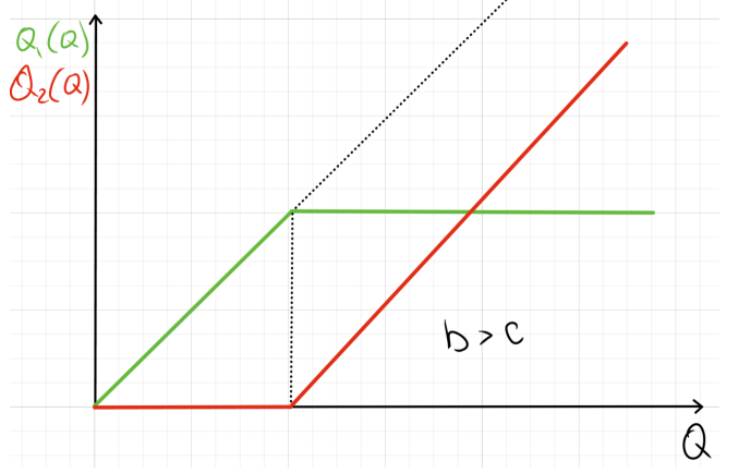 При низких c сначала производим только на первом заводе, а затем MC_1=MC_2, и после все только на втором. При высоких c сначала производим только на первом заводе, а затем сразу только на втором. Оба варианта графиков, соответственно: