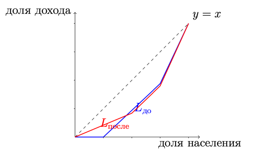 Ниже — пример кривых Лоренца до и после для случая m=3 (всего n=4 человека). Числа на рисунке не строго по масштабу, рисунок иллюстративный (синяя и красная кривая на среднем участке в действительности накладываются друг на друга).