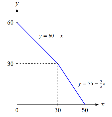 Ответ: y=min\{60-x, 75-\frac{3}{2}x\}, 0\leq x\leq 50.