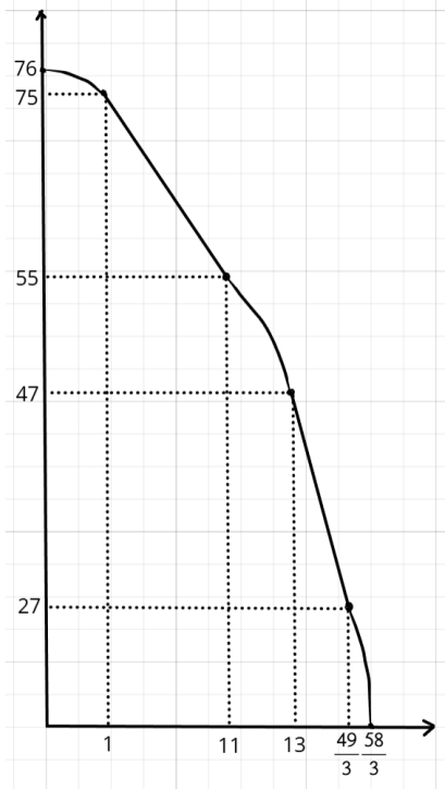 y = \begin{cases} 76 - x^2 & x \leq 1 \\ 77 - 2x & 1 < x \leq 11 \\ 56 - (x - 10)^2 & 11 < x \leq 13 \\ 125 - 6x & 13 < x \leq \frac{49}{3} \\ 36 - \left(x - \frac{40}{3}\right)^2 & \frac{49}{3} < x \end{cases}