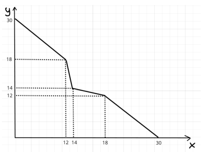 y = \begin{cases} 30 - x & x \leq 12 \\ 42 - 2x & 21 < x \leq 14 \\ 21 - \frac{1}{2}x & 14 < x \leq 18 \\ 30 - x & 18 < x \end{cases}