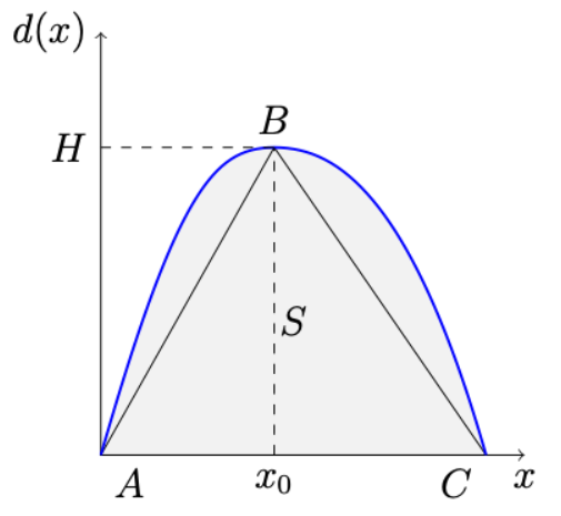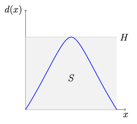 Так как график d(x) не ниже ломаной, площадь под графиком d(x) не меньше S_{ABC} = \frac{H}{2}. Откуда