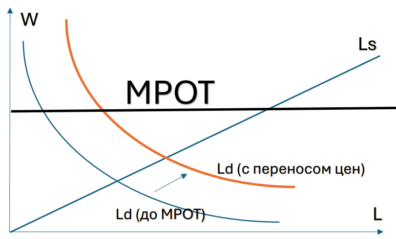 Эффект от введения МРОТ выражается в падении занятости, однако этот эффект ниже за счёт переноса МРОТ в цены (P=4*\sqrt w), т.е. на рисунке введение МРОТ приводит к росту спроса на труд! ( 5 баллов за рассуждение)